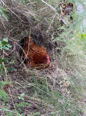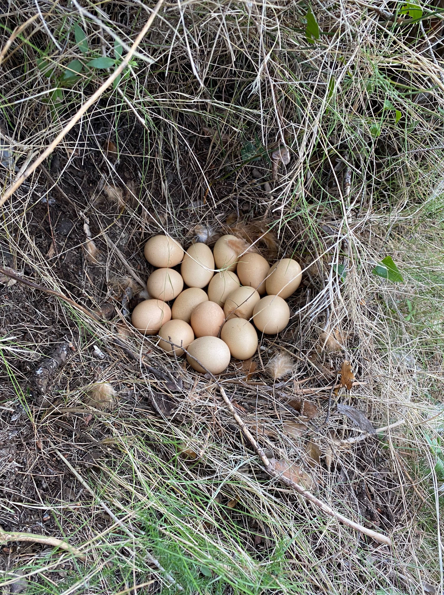 uve Roussette. Quelques mètres plus loin. Pas bien loin même, tout près. Nichée dans le creux d’un tronc d’arbre mort, à quelques mètres seulement de nous. Elle couve. Quoi ? Ici il n’y a pas de coq. Je m’approche délicatement. Je la prends dans mes bras en douceur tout en lui expliquant qu’il n’y a pas de poussins dans ses oeufs. Je suis émerveillée par sa docilité, elle se laisse faire, sans broncher, ni même me piquer. Et là je découvre…16 oeufs !!! Waouh ! 16 oeufs !